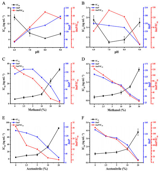 To obtain a sensitive FPIA, the effects of some physicochemical conditions on DWFPIA were evaluated by comparing the δmP/IC50 ratios under various conditions, including pH and organic solvents. Based on the optimal antibody–tracer pairs, pH values of 6.0, 7.0, 8.0, and 9.0 were tested and the other parameters of the assay remain unchanged. To clarify the effects of organic solvents on the development of DWFPIA, various concentrations of methanol and acetonitrile were tested, that is, 0%, 2.5%, 5%, 10%, 20%, and 30% (v/v) for methanol and 0%, 2.5%, 5%, 10%, and 20% (v/v) for acetonitrile. SMZ and TMP were used as the reference analyte in DWFPIA optimization to construct standard curves, seperately.