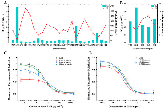 In the developed DWFPIA, fluoresceins were pH-sensitive materials, and the recognition of the tracer and antibodies could be obviously changed by the pH value of the detection system [39,44]. To obtain a high sensitivity of assays, the effect of pH on the DWFPIA was assessed. The analyte (SMZ/TMP), tracer, and mAb cocktails were mixed in a BB solution with a pH of 6.0, 7.0, 8.0, and 9.0. δmP/IC50 was employed as the principal criteria for screening of the suitable condition. As shown in Figure 4A, the highest δmP/IC50 was obtained at pH 8.0 for SMZ with δmP/IC50 of 31.3, while the highest δmP/IC50 was presented at pH 7.0 for TMP with δmP/IC50 of 141.9, with a slight difference in δmP/IC50 of pH 8.0 (Figure 4B). Thus, pH 8.0 was chosen as the optimal pH for the next studies.