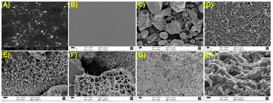 The FESEM (Make: Carl ZEISS Microscopy, ZEISS Sigma, Germany) images of the prepared nanocomposites illustrated their successful synthesis [22]. The AuNPs, with a spherical size and uniform distribution, are shown in Figure 1A. However, a thick layer of CS film had a rough surface with several tiny particles which is displayed in Figure 1B. On the other hand, Figure 1C,D CS-aCNT nanocomposite illustrated the incorporation of aCNT on the CS surface as well as the stacking of the nanocomposite. The stacking may be due to the contraction of the nanocomposite after drying [23]. However, the AuNP-modified CS-aCNT nanocomposite is shown in Figure 1E,F. It has been pictured that the AuNPs embedded on the CS-aCNT surface designate the effective attachment of AuNPs in the CS-aCNT-Au nanocomposite [24]. However, the immobilization of anti-βA antibodies and BSA onto the CS-aCNT-Au nanocomposite surface is shown in Figure 1G,H, respectively. It should be noted that the surface of the CS-aCNT-Au nanocomposite is completely covered by a thick layer of antibodies and BSA. The results revealed the successful immobilization of anti-βA antibodies and BSA on the nanocomposite.