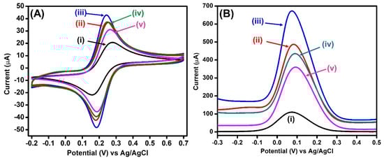 (A) CV and (B) DPV measurements of (i) GCE, (ii) CS-aCNT/GCE, (iii) CS-aCNT-Au/GCE, (iv) antibody/CS-aCNT-Au/GCE, and (v) BSA/antibody/CS-aCNT-Au/GCE.