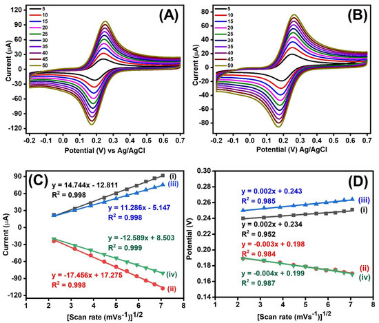 Studies of the scan rate effect of (A) CS-aCNT-Au/GCE, (B) BSA/antibody/CS-aCNT-Au/GCE. The respective straight-line calibration curve of (C) the peak current, (i) Ipa and (ii) Ipc of CS-aCNT-Au/GCE, (iii) Ipa and (iv) Ipc of BSA/antibody/CS-aCNT-Au/GCE, and (D) the peak potential, (i) Epa and (ii) Epc of CS-aCNT-Au/GCE, (iii) Epa and (iv) Epc of BSA/antibody/CS-aCNT-Au/GCE.