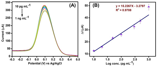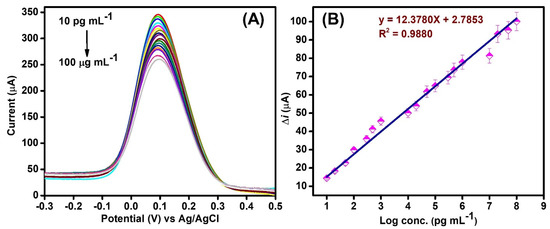 The quantitative estimation of the βA has been carried out using the BSA/antibody/CS-aCNT-Au/GCE immunosensor via the DPV technique. In the DPV, the peak height is proportional to the concentration of the target analyte. Moreover, DPV takes a short time to generate the electrochemical signal. Therefore, DPV uses a more suitable technique for rapid quantification of the analyte of interest [30]. Herein, we analyzed the broad concentrations of βA, ranging from 10.0 pg mL−1 to 100.0 µg mL−1, in PBS (Figure 4A). We experimentally detected that the DPV current gradually decreases with the increase in βA concentration. The appearance of a reduced peak current is attributed to the bulkiness of the electrode surface after the binding of βA with the anti-βA antibody of the electrode surface. A bulkier surface would retard the electron flow, resulting in a low peak current response. The LOD and limit of quantification (LOQ) of the immunosensor were calculated using Equations (3) and (4), respectively [31].