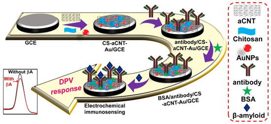 The electrochemical immunosensor was fabricated by the modification of CS-aCNT-AuNPs/GCE. In detail, 5.0 µL of (4:1) EDC/NHS was drop cast onto a CS-aCNT-Au/GCE surface, where EDC/NHS functioned as a coupling mediator between the nanocomposite and biomolecules, i.e., antibodies, to allow covalent immobilization on the electrode surface. However, the unbounded EDC/NHS on the electrode surface was eliminated through washing with DI water. Subsequently, 5.0 µL of 10.0 µg mL−1 anti-βA antibody solution was immobilized on a modified CS-aCNT-Au/GCE surface and kept overnight at 4 °C. Afterward, it was washed using phosphate buffered solution (pH = 7.0) to eliminate the unbonded antibody. Furthermore, we immobilized the 1% bovine serum albumin (BSA) on the antibody modified electrode surface for an hour, which was further washed to remove the unnecessary BSA. Here, BSA acted as a blocking agent that blocked the reactive surface of the electrode, which left after antibody immobilization. The blocking is necessary to prevent the non-specific responses of the modified electrode; otherwise, it would cause the incorrect results. After the complete fabrication of the immunosensor, which is termed a “BSA/antibody/CS-aCNT-AuNPs/GCE”, it was stored at 4 °C for electrochemical study. A schematic illustration of the stepwise modifications of the immunosensor is displayed in Scheme 1.