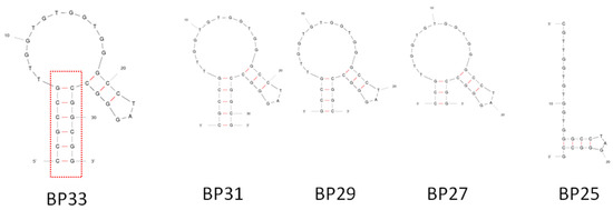 Predicted secondary structures of BP33 and its truncated aptamers.