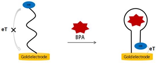 After determining the aptamer affinity and identifying the crucial region of the aptamer sequence, we reported a simple aptamer electrochemical sensor for BPA by rationally designing the aptamer sequence. Figure 4 shows the principle of the electrochemical aptasensor for the detection of BPA. The anti-BPA aptamer having a redox tag methylene blue (MB) label is immobilized on a gold electrode via gold–sulfur chemistry. In the absence of BPA, the aptamer has an open structure, and the MB labeled on the aptamer is relatively distant from the gold electrode’s surface, causing a small peak current of MB due to the weak electron transfer efficiency between MB and the electrode’s surface. When BPA is present, BPA binding induced a conformation change, and a stable structure is formed, causing the MB close to the electrode surface and a significant increase in the current of MB in square wave analysis (SWV). Therefore, the quantitative detection of BPA can be achieved by measuring the increase in current signal.