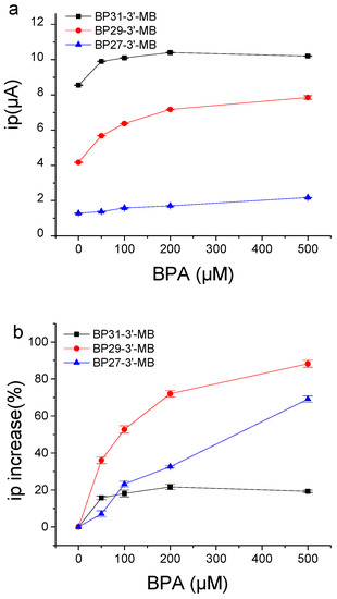 Responses of BP27-3′-MB-modified electrode, BP29-3′-MB-modified electrode, and BP31-3′-MB-modified electrode with respect to BPA. (a) Peak current (ip) values versus BPA concentrations. (b) Comparison of different aptamer-modified electrodes in the increased percentage in peak currents caused by BPA. The binding buffer contained 25 mM Tris-HCl (pH = 8.0), 100 mM NaCl, 25 mM KCl, and 10 mM MgCl2. Frequency was set as 250 Hz in SWV.