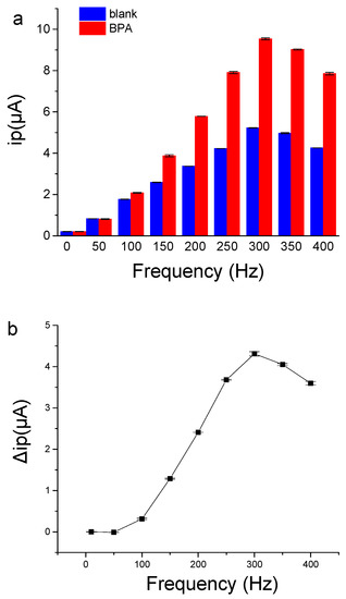 The frequency of SWV had great influence on the sensing performance of the aptamer sensor. As shown in Figure 6, when the frequency was low, the current signal was weak, and the ip change caused by BPA was also small. When the frequency increased to 300 Hz, the peak current and the ip change caused by BPA binding were the largest. The results demonstrate that the frequency of SWV is a key factor for aptamer electrochemical sensors, which is consistent with a previous report [32]. Therefore, the frequency of 300 Hz in SWV was selected for the electrochemical detection of BPA to achieve more sensitive signal-on responses to BPA binding.