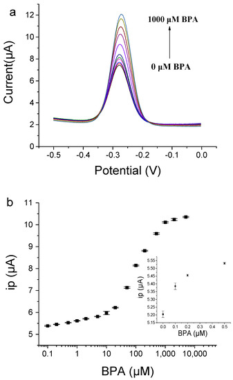 After the detection of BPA, the electrochemical aptasensor regenerated by simple washing with ultrapure water. As shown in Figure S4, the ip value was close to the ipblank after washing with ultrapure water, meaning that BPA dissociated from the electrode by washing. This can be attributed to the fact that the aptamer’s affinity binding requires metal ions in the buffer, and water without the presence of metal ions causes the aptamer lose affinity. After cycles of regeneration processes, the BP29-3′-MB-modified electrode still had a good response to BPA. The result indicates that this electrochemical aptasensor can be reused.