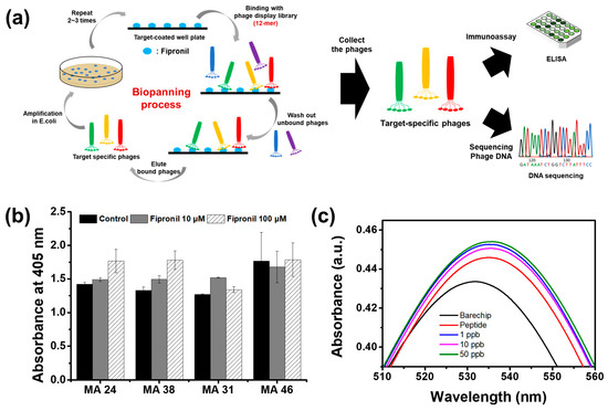 Methods of screening peptides that selectively respond to a specific substance represent another challenge, which is resolved by the phage display technique. In this technique, the phage displays the expressed peptides on its surface, followed by the development of a specific peptide that binds strongly to a particular target [19,20,21,22]. This technique has been widely used in the study of selecting functional peptides that bind to a target, because it has the advantage of amplifying phages with the desired peptide and analyzing the sequence to identify the amino acids of peptides [23,24]. For example, Cho, et al. discovered affinity peptides that bind specifically to interleukin-33 (IL-33) using the phage display technique and used the specific peptide to achieve drug development or allergy diagnosis [25]. Therefore, peptide screening that binds to specific substances, which is a huge advantage of the technique, can discover peptides that bind specifically to the residual pesticide, fipronil.