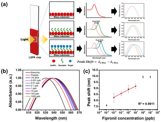 Detection of fipronil standard solution with high sensitivity through optimized LSPR sensor chip: (a) peak shift observed as the Au NPs bind, peptide binds, and fipronil binds; (b) sensitivity of LSPR sensor chips under various concentrations of fipronil standard solutions, confirmed with UV–Vis spectrum; and (c) changes in the spectrum peak at different concentrations of fipronil standard solution reacted on the chip.