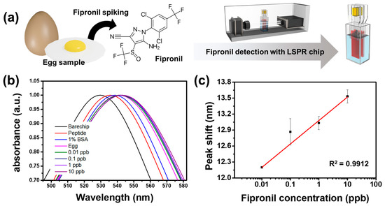 Detection of fipronil-included spiked egg samples using optimized LSPR sensor chips: (a) schematic illustration of the experiment, (b) sensitivity of LSPR sensor chips under various concentrations of spike samples, and (c) changes in the spectrum peak at different concentrations of spike samples reacted on the chip.