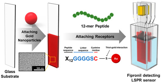 Fipronil in existing foods is assayed using highly sensitive analytical techniques such as gas chromatography–mass spectroscopy (GC–MS), liquid chromatography–tandem mass spectrometry (LC–MS/MS), and enzyme-linked immunosorbent assay (ELISA), which have advantages in that both quantitative and qualitative analysis is possible with very high sensitivity, but they also have several drawbacks as they require expensive equipment operated by experts and take a long time to extract, preprocess, and analyze results [9,10,11]. In addition, various methods for analyzing low concentrations of fipronil in food samples have not been developed. Hence, detection technology that can analyze fipronil easily and quickly is necessary to overcome these shortcomings and monitor products at the food distribution site. Localized surface plasmon resonance (LSPR) is one of the analysis methods that can overcome these shortcomings and analyze samples in the field. LSPR is a detection method using the characteristic that polarization occurs on the nanoparticle surface and vibrates locally when light with various wavelengths is irradiated on materials with local surfaces, such as gold- and silver-based metal nanoparticles [12,13]. Using this analysis method, the analysis is applied in various fields, such as biology, the environment, food, and medicine [14,15,16,17]. However, selectively detecting one specific substance with high sensitivity with LSPR sensors with only gold or silver nanoparticles attached is difficult [18]. Therefore, the sensitivity and selectivity of the LSPR sensor should be improved by screening the peptide that selectively binds to fipronil and attaches to the nanoparticles.