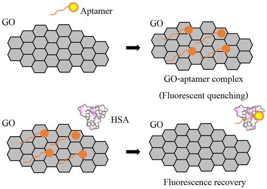 A novel, sensitive detection method for urinary albumin was developed using graphene oxide-based fluorescent detection [15,16]. This platform uses an aptamer, a short single DNA with <100 nucleotides specifically bound to HSA, and the quenching property of graphene oxide to detect albumin in human serum and urine samples, as shown in Figure 1.