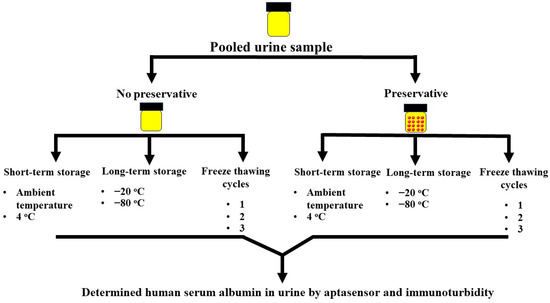 All urine samples were collected and studied under the ethical approval number, HE601035, from the office of the Khon Kaen University Ethics Committee in Human Research (Institutional Review Board number IRB00001189), Khon Kaen University, Thailand. Fourteen random spot urine samples were collected in urine collection cups. Then, 5 mL of urine sample was pipetted from each cup and pooled in sterile 50 mL Corning ™ polypropylene tubes. The pooled urine sample was divided into two tubes, and boric acid (2% w/v) was added to one tube. The aliquots were further subdivided to study the effects of temperature and storage conditions (over a short term at 4 °C and ambient temperature (Ta, 25 °C)), long term at −20 and −80 °C, and following 1–3 freeze–thaw cycles (Figure 2). HSA concentrations in all samples were analyzed using graphene oxide-based fluorescent detection (Excitation at 630 nm and emission at 670 nm) and immunoturbidimetry.
