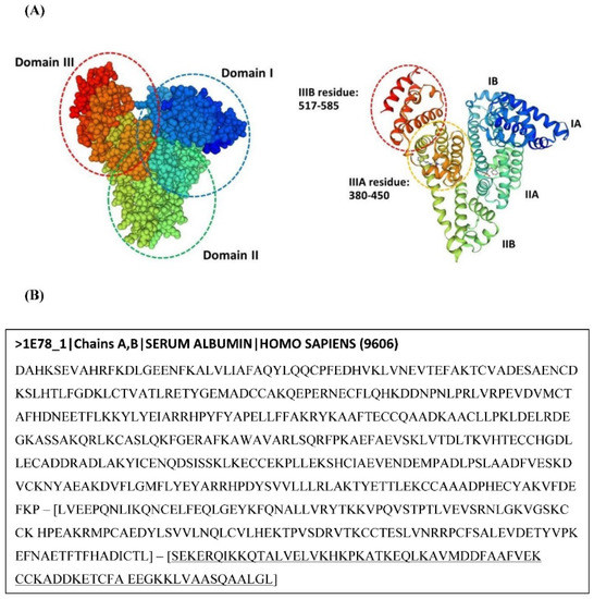 HSA structure (A) and HSA amino acid sequence with subdomain IIIB showing under the underlined sequence (B).