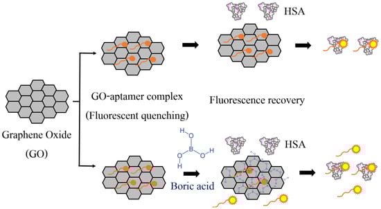 A schematic illustration of the GO-based fluorescence detection of HSA in urine samples preserved in boric acid is shown in Figure 1 and Figure 4. In the absence of HSA, the aptamers are adsorbed onto the GO surface by π–π stacking, and the fluorescence of labeled dye is quenched via an energy transfer from the dyes to the GO. However, in the presence of HSA, the weak binding between the GO–aptamer complex allows the aptamer to fall off the GO surface and bind to the HSA, causing fluorescence recovery. It has been reported that there is a strong intermolecular hydrogen bonding between the hydroxyl groups in boric acid and the hydroxyl and carbonyl groups in GO [21]. Therefore, it is possible that boric acid competitively binds to GO once added to urine in the aptamer–GO complex, leading to a higher fluorescent recovery signal, compared with that in case of urine without the preservative. Our results supported this hypothesis, as the fluorescence intensity of the HSA analysis from PBS–boric buffer was higher than that from PBS without boric acid. The maximum fluorescent intensities were 8796 and 16,247 relative fluorescence units under PBS and PBS–boric buffer conditions, respectively.