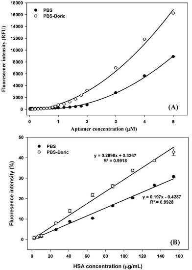 In sterile 500 μL Eppendorfs, 15 μL of 5 mg/L GO solution was mixed with 15 μL of H8 aptamer at various concentrations between 0.02 and 5 μM. The mixed solution was incubated at Ta in the dark for 5 min to allow the formation of the aptamer–GO complex and to quench the fluorescent signal. Subsequently, 20 μL of 30 μg/mL HSA was added to the solution, which was then incubated at Ta in the dark for 30 min. Subsequently, the solution volume was adjusted to 200 μL by the addition of PBS in the control group and 2% (w/v) boric–PBS buffer in the experimental group. The fluorescent signal from each was then measured using a QuantusTM Fluorometer (Promega Corporation, Madison, WI, USA). The optimal aptamer concentration was taken as the concentration that completely quenched the fluorescence intensity.