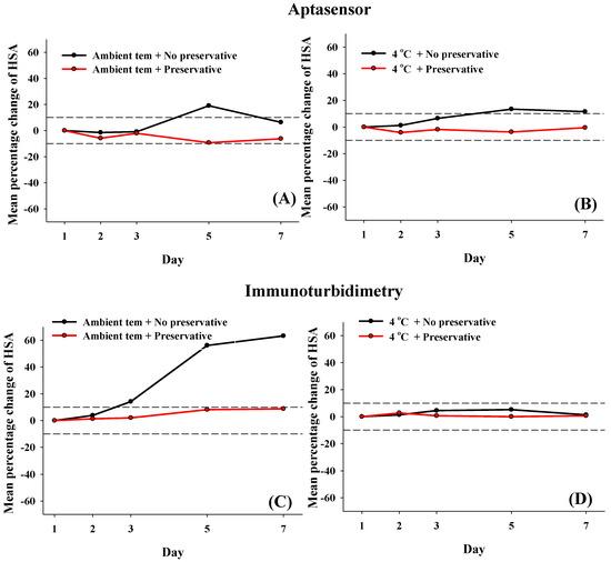 The mean percentage change in HSA concentration was analyzed using our aptasensor and immunoturbidimetry, with and without 2% (w/v) boric acid, after short-term storage (1, 2, 3, 5, and 7 d) at Ta and 4 °C and compared (Figure 6). Under short-term storage (up to 7 d) at Ta and 4 °C, microalbumin remained stable, as determined by the aptasensor and immunoturbidimetry assays (Figure 6, red line). Smaller changes in microalbumin were observed at Ta when aptasensor assay was performed (over 3 d, −0.89% change) than with the immunoturbidimetry assay (over 2 d, 3.87% change), as shown in Figure 6A,C, black line. Based on the aptasensor readings, the mean percentage change in the microalbumin analyzed was −6.28% and −0.52% at Ta and 4 °C, respectively, and it remained stable for up to 7 d. In contrast, immunoturbidimetry assays showed mean percentage changes in microalbumin at 8.84% and −0.68% at Ta and 4 °C, respectively. Without preservative and at 4 °C, microalbumin changes were stable for only up to 3 days when analyzed by the aptasensor (6.45%) (Figure 6B, black line), but they were stable for up to 7 d when determined using the immunoturbidimetry assays (1.29%) (Figure 6D, black line).