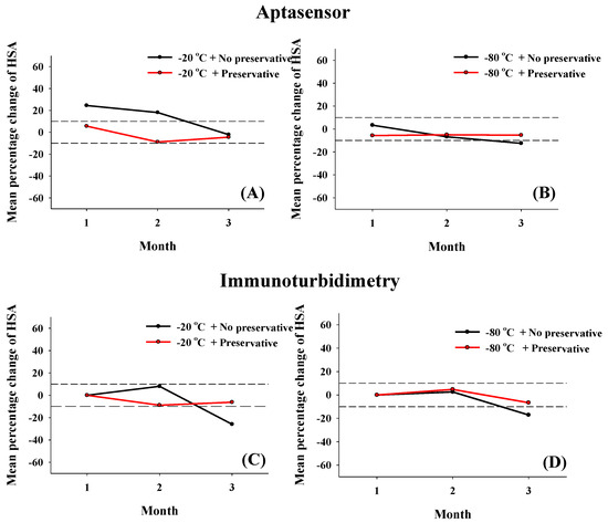 The mean percentage change in microalbumin concentrations, as analyzed using our aptasensor and immunoturbidimetry assay in the presence and absence of 2% (w/v) boric acid following long-term storage conditions (1, 2, and 3 months) at −20 and −80 °C, was determined (Figure 7). The addition of boric acid to urine samples stabilized the microalbumin content (analyzed using the aptasensor and by a standard method) for up to 3 months at −20 and −80 °C (Figure 7, red line). The mean percentage changes in microalbumin concentrations, as analyzed using the aptasensor, were −4.52% and −5.34% at −20 and −80 °C, respectively, over 3 months. Similarly, microalbumin concentrations, as analyzed by immunoturbidimetry, were determined to change by −6.28% and −6.64% at −20 and −80 °C, respectively. These values were >10% higher than the mean percentage microalbumin changes in urine samples that did not contain the preservative, stored at −80 °C for 3 months, based on both detection methods (Figure 7A,C, black line). However, at 2 months, the results obtained from both assays were similar (Figure 7B,D, black line).