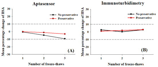 Microalbumin was found to be stable in fresh urine samples with and without boric acid. Our study showed that the addition of boric acid to urine samples stabilized microalbumin during freeze–thaw cycles, with percentage changes of 2.86% and −3.09%, as determined using the aptasensor and standard assay, respectively (Figure 8, red line). In contrast, in non-preserved urine, the percentage change in microalbumin concentrations rapidly dropped (−9.36%) during three freeze–thaw cycles, as determined using the aptasensor; nevertheless, the microalbumin concentration remained at an acceptable value (<10%) (Figure 8A, black line).