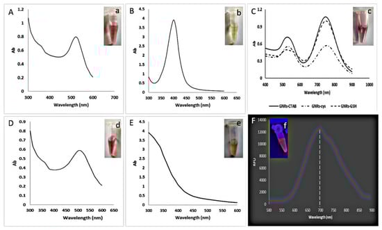 TEM analysis and UV/visible spectroscopy were used to analyze the metal nanoparticles. Figure 1A–F shows the UV/Vis spectra of metal NPs in the 200–600 nm region of spectra. In this case, the local surface plasmon resonance (LSPR) capabilities are greatly dependent on the material, size, and form of the utilized metallic nanoparticles []. Noble metal nanoparticles exhibit distinct adsorption in the visible area of the electromagnetic spectrum, which is associated with their collective oscillation of free electrons. Synthesis of Au NPs, Ag NPs, GNRs, Au–Ag core–shell, and BSA-NCs were verified by their absorption peak at 525, 400, 520–750, 500, and 350 nm, respectively (Figure 1A–E). The citrate-capped Au NPs and Au–Ag NPs were produced as ruby red (Figure 1a–d), and the change in color from white to yellow demonstrated the production of the silver nanoparticles (Figure 1b). BSA is a well-characterized protein that has long applications as a capping agent for the formation of nanoclusters due to its high affinity for inorganic salts []. In this study, we synthesized a BSA–Au nanocluster that emitted a highly fluorescent light with a maximum wavelength at 700 nm (Figure 1F,f).