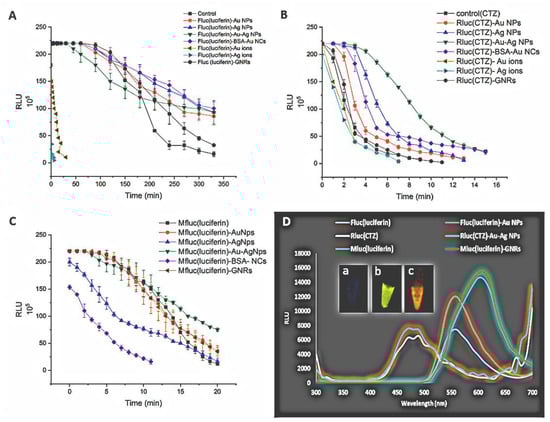On the other hand, Renilla luciferase activity was increased 3–5 times more than free enzyme in the presence of gold, silver, gold–silver core–shell nanoparticles, and BSA–Au nanoclusters until 15 min. In the presence of gold nanorods, an increase in luciferase activity was observed only within 10 min. In addition, Renilla luciferase activity reached to less than 1% in 5 min in the presence of metal ions. Gold–silver core–shell nanoparticles had the most excellent outcome, with the SPR spectrum (λmax = 500 nm) overlapping well with the maximum emission of Renilla luciferase at 480 nm (Figure 3B).