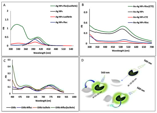 UV/visible absorption spectra of (A) Ag NPs, (B) Au–Ag NPs, and (C) GNRs with and without Rluc, Fluc, and Mfluc. (D) Schematic illustration of bioluminescence enhancement of luciferase–metal nanoparticles complex achieved through the coupling effect.
