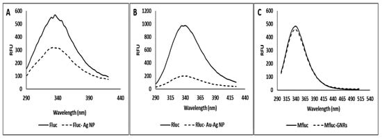 The enzyme displays a fluorescence emission spectrum with a maximum at 338 nm (Figure 5) under our experimental conditions. This fluorescence emission maximum is characteristic of tryptophan (Trp) placed in a relatively hydrophobic environment [,]. When enzymes were immobilized on Ag, Au–Ag core–shell NPs, or GNRs, the fluorescence intensity dropped without shifting the maximum emission wavelength. The results revealed that metal NPs engaged and bonded with high affinity to enzymes, resulting in conformational alterations. The observed fluctuations in fluorescence intensity and maximum could result from the Trp environment changing, thereby altering the conformation of the enzyme. This alteration was associated with a new conformational state (unfolded state) []. This study showed that the addition of silver and gold–silver nanoparticles to firefly and Renilla luciferase reduced the fluorescence intensity of tryptophan, while gold nanorods had a minimal effect on the fluorescence intensity of mutant luciferase.