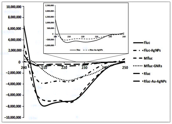 Luciferases were considered in this study due to their roles in chemical transformations leading to light emission with many biological applications, including beneficial reporter proteins for gene expression, ATP assays, environmental bioassays based on the changes in bioluminescent intensities, and biosensors. In summary, according to the results presented in this communication, citrate-stabilized AuNPs, AgNPs, Au–AgNPs, BSA-AuNCs, and GNRs nanoparticles had diameters of ~29, 13.5, 3.0, 31, and 49.0 nm, respectively, and exhibited typical absorption bands. Electrostatic interactions, dynamic exchange with citrate, and hydrogen bonding to form a protein corona demonstrate the enzyme’s attachment to the nanoparticle surface, as reported earlier []. CD and fluorescence spectroscopies were used to study the enzyme–nanoparticle interaction. We detected a significant drop and change in the ellipticity and emission maximum. We effectively demonstrated that all-metal nanoparticles and gold nanorods boosted the activity of firefly and Renilla luciferase by five times compared to free enzymes after incubation at room temperature. However, mutant luciferase activity significantly decreased in the presence of silver nanoparticles and BSA–Au nanoclusters. Käkinen et al. (2013) reported a dose-dependent inhibition of firefly luciferase activity boosted by citrate-coated Ag nanoparticles (AgNPs). The reaction of functional groups of proteins, especially S– and N– with Ag+ ions released by the metal NPs stimulated enzyme inhibition rather than protein unfolding [].
