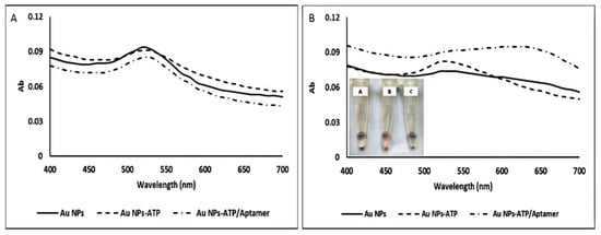 In this study, we investigated the effect of the target molecules and the aptamer bound to the target molecules on the stability of nanoparticles and luciferase activity. Figure 7 shows that gold nanoparticles were aggregated in the presence of 100 mM sodium chloride salt, and a blue color change was observed. In addition, although single-stranded DNA molecules make nanoparticles stable, they cannot protect nanoparticles from aggregation if they bind to the target molecule. While ATP has multiple negative charges and can stabilize the AuNPs in the presence of salt [], changes in the stability of gold nanoparticles in the presence and absence of the target molecule can be seen through absorption spectroscopy.