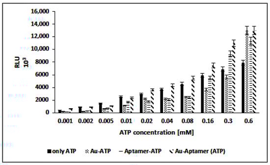 Furthermore, in addition to binding to the aptamer, ATP is easily attached to the surface of the nanoparticles, increasing its availability for the luciferase enzyme. The effect of gold nanoparticles on increasing luciferase activity was also mentioned in the previous sections. The bioluminescence-based assay for ATP is a sensitive method, but the intensity of the bioluminescence signal is usually low for low concentrations. The results of this study show that the presence of gold nanoparticles increases the intensity of the bioluminescence signal. It is an advantage to measure the low concentrations of the analyte, especially ATP, and the presence of aptamer increases the selectivity. The results in Figure 8 show that the signal intensity in the presence of gold nanoparticle–ATP complexes was higher than only ATP in concentrations of 5–40 μM.