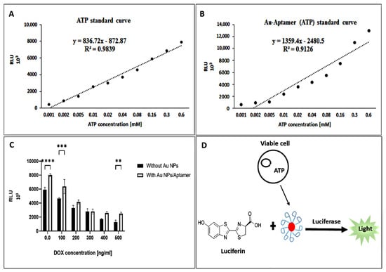 To further confirm that the assay is also applicable to ATP detection, we conducted the methodology to quantify ATP in MCF-7 cell extracts treated with different concentrations of doxorubicin. Figure 9C shows the luciferase activity with and without the AuNP/aptamer colloid in the presence of cell lysates treated with DOX concentrations of 0, 100, 200, 300, 400, and 500 ng·mL−1. We estimate that the concentration of ATP in the cell lysate was 1.8–5.8 ± 0.06 mM; this value agrees with the normal range of ATP between 2 and 10 mM in cells [,]. The bioluminescence is proportional to the ATP concentration when ATP is the limiting component in the luciferase reaction. A higher luminescent signal indicates higher ATP levels. A comparison of this study with other ATP detecting methods is summarized in Table 3.