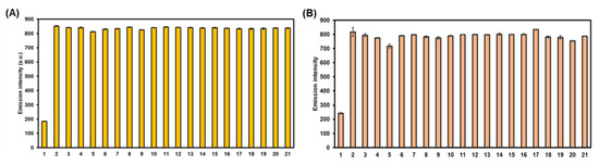 Bar charts demonstrating fluorescence intensities at 512 nm of compounds 2 (A) and 3 (B) in the presence of HOCl with and without various analytes in MeOH—5 mM PBS (1:1 v/v). [BODIPYs] = 0.2 µM, [HOCl] = 40 µM, [Other analytes] = 40 µM. 1: blank, 2: HOCl, 3: HOCl + H2O2, 4: HOCl + 1O2, 5: HOCl + ·OH, 6: HOCl + ONOO-, 7: HOCl + tBuOOH, 8: HOCl + tBuO·, 9: HOCl + ·O2−, 10: HOCl + Ascorbate, 11: HOCl + L-Cysteine, 12: HOCl + L-Glutathione, 13: HOCl + NO3−, 14: HOCl + NO2−, 15: HOCl + SO42−, 16: HOCl + SO32−, 17: HOCl + S2O52−, 18: HOCl + S2O32−, 19: HOCl + HSO4−, 20: HOCl + CO32−, 21: HOCl + HCO3−. Error bars represent standard deviation (n = 3).