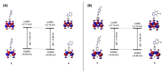 Frontier molecular orbitals (HOMO and LUMO) of compounds 2 and 4 (A), and compounds 3 and 5 (B) and their energy gaps (ΔE in eV) computed by M062X/6-311G* level of theory. The HOMO and LUMO orbitals are plotted with isovalue of 0.02.