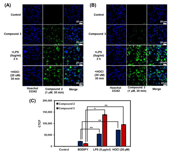 Fluorescence images of compounds 2 and 3 in RAW264.7 cells: (A) fluorescence images of compounds 2 and (B) compound 3. For the imaging of endogenous HOCl, RAW 264.7 cells were incubated with 1 μM of the probes for 30 min and then 5 µg/mL of LPS for another 2 h. For the imaging of exogenous HOCl, RAW 264.7 cells were stained with 1 μM of the probes for 30 min and then NaOCl (20 µM) for another 30 min. The images were obtained using a laser scanning confocal microscope (Nikon A1Rsi, 63× oil immersed optics). Scale bar = 20; (C) Quantitative corrected total cell fluorescence (CTCF) data, which were quantified using ImageJ and represent the mean ± SD (n = 30). Statistical analysis is based on T-test (* p < 0.05, ** p < 0.01, *** p < 0.001).