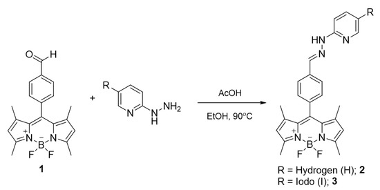 The BODIPY probes were synthesized by acid-catalyzed condensation reactions between the aldehyde-linked BODIPY (1) and 2-hydrazinopyridine/2-hydrazino-5-iodopyridine yielding compounds 2 and 3, respectively (Scheme 1). The BODIPYs were fully characterized by nuclear magnetic resonance spectroscopy (1H NMR and 13C NMR), and mass spectrometry (MS) (Figures S1,S2,S7, Supplementary Materials) and the resulting spectra matched well with the results in the previous literature [50].