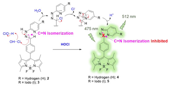 In summary, the known pyridylhydrazone-linked BODIPY (2) and its iodo-substituted analogue (3) were successfully proven as highly selective chemosensors for hypochlorous acid (HOCl) through triazolopyridine cyclization of the pyridylhydrazone moiety. The single-crystal X-ray diffraction (SC-XRD), the infrared spectroscopic technique, and the NMR titration experiment confirmed the formation of resulting triazolopyridine-tethered BODIPY derivatives. In addition, the photophysical studies revealed that these two probes could efficiently detect HOCl through a fluorescence enhancement mechanism in MeOH—5 mM PBS (1:1 v/v) with the limit of detections of 0.21 µM and 0.77 µM for 2 and 3, respectively. The DFT calculations disclosed that the change of energy gaps (ΔE) between the open forms and the cyclic forms of the BODIPYs are negligible, which is consistent with the experimental data. Finally, these two compounds displayed a great biocompatibility toward RAW 264.7 cells and could efficiently visualize both endogenous and exogenous HOCl in living cells. It is worth noting that the BODIPY 3, containing iodo substituent, possesses good cell membrane permeability due to its hydrophobicity.