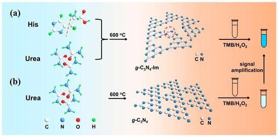Schematic illustration of one-pot annealing preparation of g-C3N4-Im (a) and g-C3N4 (b) with enhanced peroxidase-like activity for H2O2 detection.