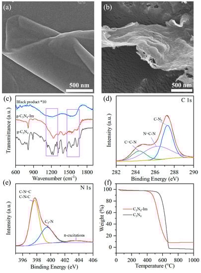 The structure of g-C3N4-Im was characterized by X-ray diffraction (XRD). As shown in Figure S1 (Supplementary Materials), the two typical peaks of g-C3N4-Im at 12.8° and 27.1° exhibited a lower intensity than g-C3N4 []; meanwhile, the peak at 27.1° was shifted to a low degree compared with g-C3N4, which indicates that the ordered triazine structure was partly destructed []. The morphology and structure of g-C3N4 and g-C3N4-Im were observed by SEM (Figure 2a,b). The structure of g-C3N4 comprised ultrathin two-dimensional nanosheets of a large size (>1 µm), which is the typical structure of the graphitic phase (Figure 2a). In contrast, there were many folds and holes for the structure of g-C3N4-Im (Figure 2b), which further confirms the results from XRD. To figure out the chemical structure of g-C3N4-Im, FTIR data were collected (Figure 2c). The spectra of g-C3N4-Im showed two broad peaks, ranging from 1050 cm−1–1350 cm−1 and 1420 cm−1–1630 cm−1, respectively, which are attributed to the imidazole ring (Figure S2) [,,,]. This result was further confirmed by Raman spectra (Figure S3). The broad peaks, ranging from 1000 cm−1–1750 cm−1, are ascribed to superposition peak g-C3N4-Im and imidazole [].