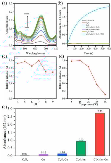 (a) UV–Vis spectra of mixed solution of TMB, H2O2 and g-C3N4-Im-Cu with time increasing. (b) The time-dependent absorbance changes at 652 nm of different catalysts. The determining factors in the test of peroxidase-like activity of g-C3N4-Im-Cu were (c) temperature and (d) pH. (e) The absorbance value of 652 nm at 10 min of TMB and H2O2 solution in the presence of g-C3N4 (black), Cu(Ac)2 (purple), g-C3N4-Cu (blue), g-C3N4-Im (green) and g-C3N4-Im-Cu (red).