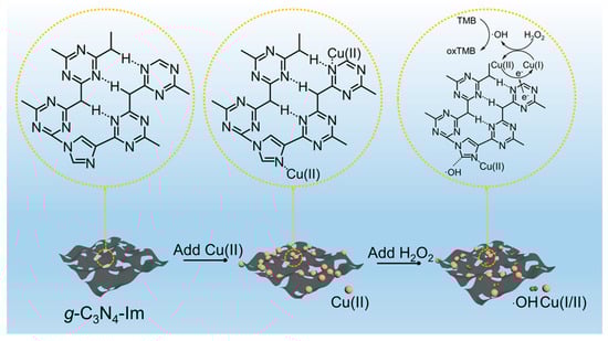 To further investigate the catalytic mechanisms of TMB oxidation, radical trapping experiments were performed. The decreased absorbance value and enhanced fluorescence signal in Figure S10 indicated that ·OH radicals were produced during the catalytic reactions []. Based on the above experiments, the suggested catalytic mechanism was proposed (Figure 4 and Figure S11). The intercalation of the imidazole ring broke the ordered structure of g-C3N4-Im and, upon adding Cu(II), the Cu(II) was captured by the imidazole ring and C-N heterocycle as active sites. In the reaction of catalyzed TMB oxidation, Cu(II) ions can be reversibly converted between Cu(II) and Cu(I) in H2O2 solutions [,]; meanwhile, ·OH could be stabilized on the imidazole ring, thus accelerating the decomposition of hydrogen peroxide.