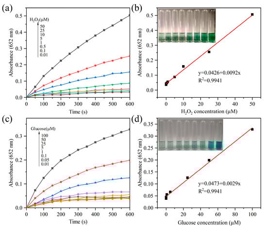 The time-dependent absorbance changes at 652 nm with different concentrations of (a) H2O2 and (c) Glucose. Linear calibration plot for (b) H2O2 and (d) glucose, calculated from (a) and (c), respectively. Inset: optical photograph of colored products in H2O2 and glucose with different concentrations.