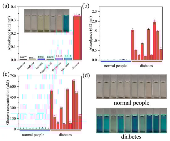 To explore the possibility of the use of biosensor for glucose detection in real samples, lots of experiments were performed as follows: firstly, fructose, maltose, lactose, ascorbic acid, dopamine and uric acid were used to investigate the selectivity and anti-interference of this biosensor. Figure 6a demonstrates that the absorbance of oxidized products from these glucose analogs and interfering substances were negligible in contrast to that of glucose under the same concentration, indicating that this biosensor shows a satisfactory selectivity and anti-interference for glucose, which resulted from the high affinity of glucose oxidase for glucose. Meanwhile, 20 samples of clinical urine samples of diabetic patients and healthy controls obtained from Union Hospital, Tongji Medical College were used for the following analysis. As shown in Figure 6b–d, the absorbance (652 nm) of urine samples from diabetic patients behaved over two orders of magnitude higher than that of the healthy controls. Thus, we can easily distinguish the urine samples of normal people (no color change) and diabetic patients (blue color) by the naked eye (Figure 6d). Consequently, the results indicate that the g-C3N4-Im-Cu-based biosensor shows potential for applications in the detection of glucose from clinical urine samples.