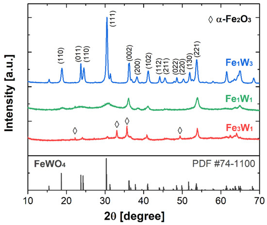 XRD patterns of Fe1W3 (blue line), Fe1W1 (green line), and Fe3W1 (red line). Corresponding pattern for FeWO4 (JCPDS file no. 74-1100) is given as reference.