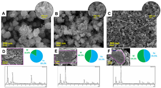 FE-SEM micrograph of (A) Fe3W1; (B) Fe1W1, and (C) Fe3W3. Corresponding elemental analysis is given in (D–F).