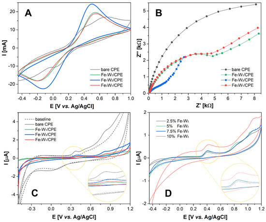 (A) CVs of 5 mM K3[Fe(CN)]6/K4[Fe(CN)]6 (1:1) at unmodified CPE, Fe1W1–, Fe1W3– and Fe3W1–modified CPE. Supporting electrolyte 0.1 M KCl (scan rate 50 mV/s); (B) EIS at CPE and modified-CPE of 5 mM K3[Fe(CN)]6/K4[Fe(CN)]6 (1:1) in 0.1 M KCl; (C) CV voltammograms of CPE, Fe1W1/CPE, Fe1W3/CPE, and Fe3W1/CPE 30 mM MORPH and (D) CVs with different content of the Fe1W3 in CPE at 0.1 mM MORPH in BRBS pH 8 (scan rate 50 mV/s).