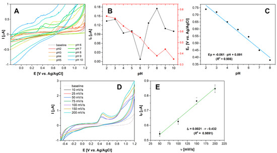 (A) CV voltammograms for 0.1 mM MORPH solution in BRBS at pH 2–10 (scan rate 50 mV/s). (B) Evolution of peak current and peak potential with pH. (C) Linear fit of Ep vs. pH. (D) CV voltammograms for 0.1 mM solution of MORPH on BRBS at pH 8, scan rate 50–200 mV/s and (E) Ip vs. log v.