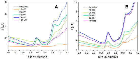 The most used electrochemical methods are different pulsed voltammetry (DPV) and square wave voltammetry. Comparing those two methods for 0.1 mM MORPH detection, the SWV method obtained a higher current peak and that method was selected for additional optimization. With the aim to achieve the best analytical performance of the detection method, suitable parameters for the SWV method were studied in the BRBS solution at pH 8 containing 0.1 mM of MORPH. Variations of step pulse amplitude in the range from 10 to 100 mV and frequency from 10 to 100 mV were carried out. When one parameter was optimized, others were kept constant. It was found that the optimization of each parameter promoted an increase in the oxidation current up to a certain value, after which it starts to decrease, followed by the increase in the background current and usually widening in the peak. The compromise values were as follows: pulse amplitude of 50 mV and frequency 75 mV (Figure 5A,B). Thus, these parameters were used for the construction of the calibration curve and method development.