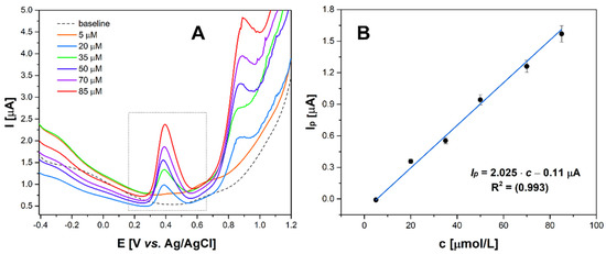 Parameter optimization was a necessary condition for the estimation of the analytical performance of the detection method. For this purpose, a certain amount of the MORPH standard solution was added in the electrochemical cell, filled with BRBS at pH 8, and SWV was recorded under optimized conditions. The SWV voltammograms are shown in Figure 6A, whereas the corresponding calibration curve was constructed and shown in Figure 6B. In the concentration range from 5 µM to 85 µM of MORPH, the calibration curve shows excellent linearity with the corresponding linear equation , where IA is the oxidation current, and c is the concentration of MORPH in µM. The regression coefficient for this linearity was R2 = 0.993. The limit of detection (LOD) and limit of quantification (LOQ) were calculated as and , respectively. In these equations, SD is given as the standard deviation of the blank. The LOD of the method was calculated to be 0.58 µM, and the LOQ was 1.94 µM. When comparing our results with the results found in today’s literature in terms of detection limit and linear range (Table 1), it can be concluded that the results obtained in this work are comparable with or better than the results of electrochemical sensors reported so far.