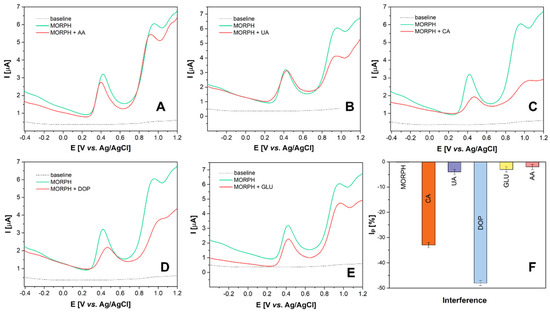 SWV voltammograms of MORPH at Fe1W3@CPE in absence (green line) and presence (red line) of (A) ascorbic acid (AA); (B) uric acid (UA); (C) citric acid (CA); (D) dopamine (DOP); (E) glucose (GLU); and (F) peak current signal (%) before and after addition of interferents.